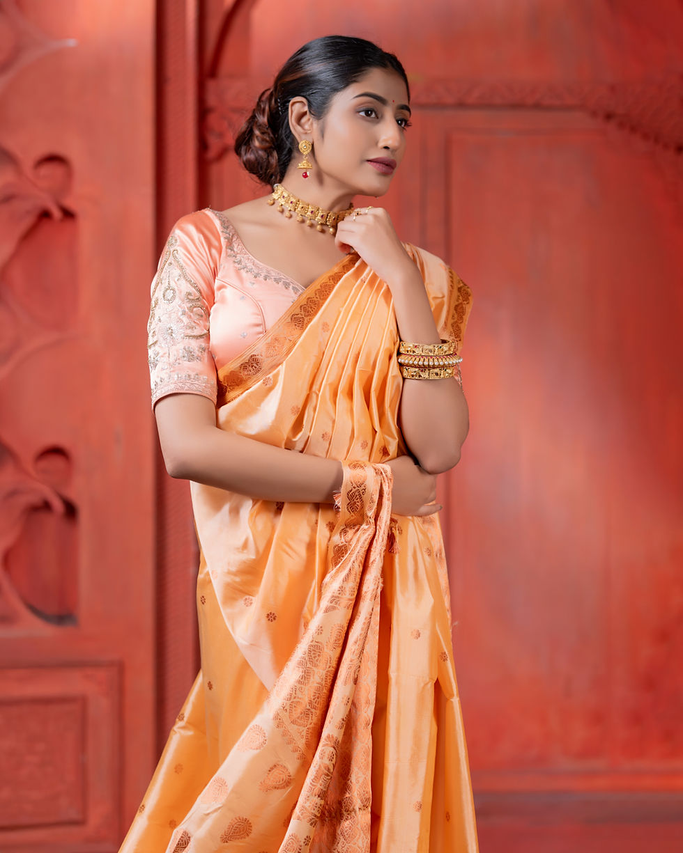 Pure Mulberry Silk Peach-Apricot With Golden Zari Threadwork