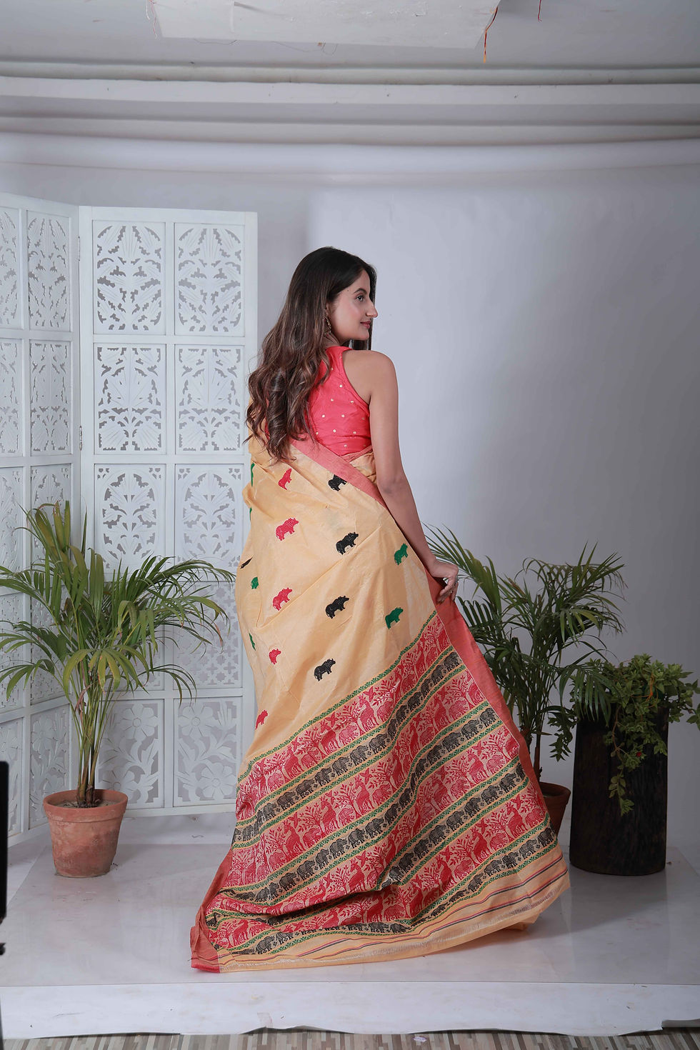 Pure Assam Handloom Mulberry Silk Saree In Beige With Green Threadwork