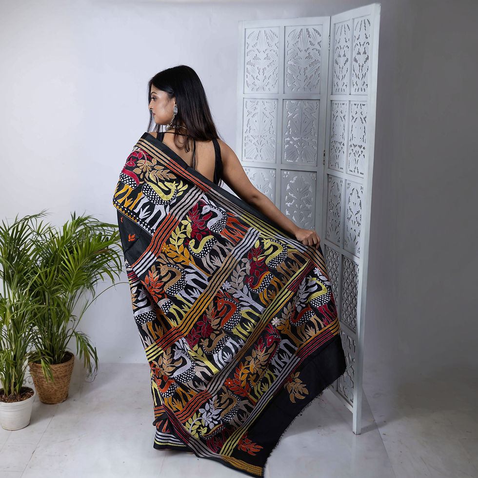 Elegant Black Pure Bangalore Silk Saree With Multicoloured Kantha Stitch Embroid