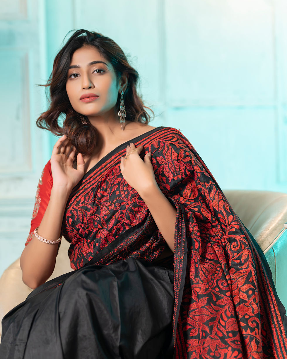 Pure Bangalore Silk Saree In Black With Rust Red Kantha Embroidery